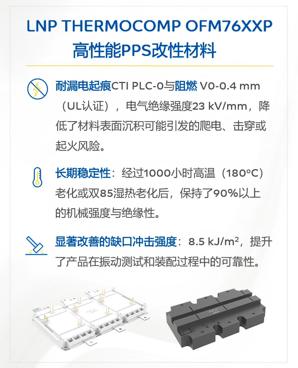 SABIC公司近期推出的LNP™ THERMOCOMP™ OFM76XXP改性PPS材料,正是为应对这一挑战而研发的创新解决方案。该产品专门针对高压电驱和功效模块结构部件设计,在电气绝缘、机械强度和长期稳定性方面均有卓越表现。